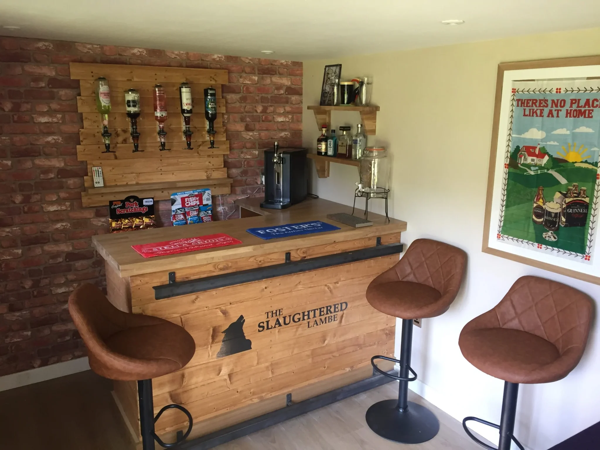 • Home Bar – Rustic wood panelling, bespoke shelving, bar stools, and even draught beer pumps